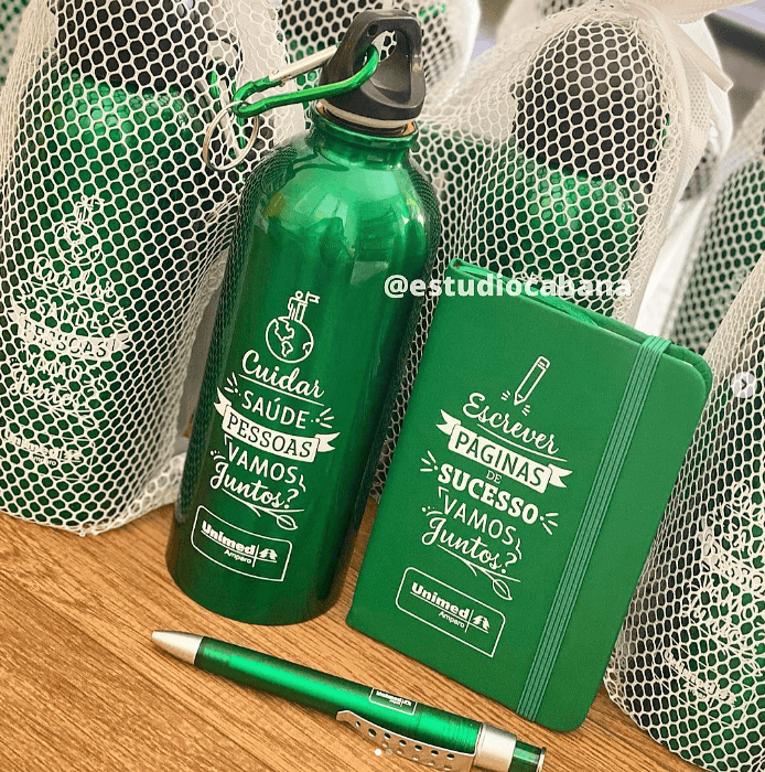 Kit composto por squeeze de alumínio, caderneta e caneta personalizada. O kit vai em saquinho de tecido, pronto para presentear! Motive seus novos colaboradores a serem mais saudáveis no dia a dia do trabalho. Personalização da caderneta, squeeze e caneta em 01 cor.