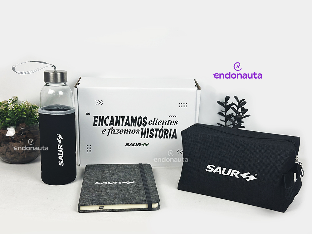 Kit com caixa em papelão personalizada colorida por fora (27x18x9cm), acompanha squeeze em vidro com luva de tecido personalizada, necessaire personalizada e caderneta 14x21cm com capa em tecido personalizada.
