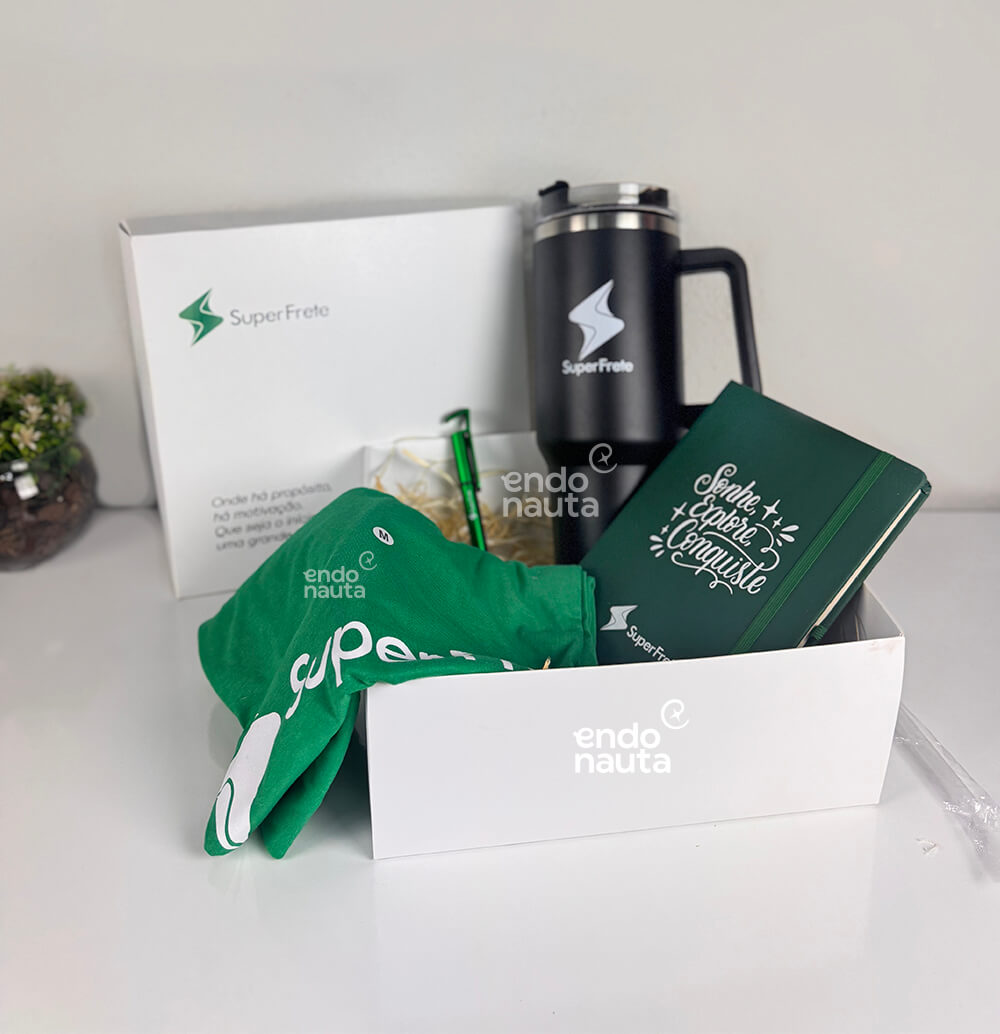 Super Kit Onboarding contendo Caixa com fita personalizada com a marca da sua empresa, caneca em alumínio, cadernos de anotações, fone de ouvido e cartão de boas vindas. Não há como se sentir mais bem recebido! Excelente gift para sua ação de Employer Branding.