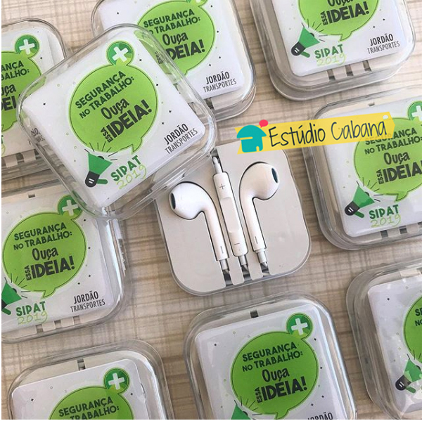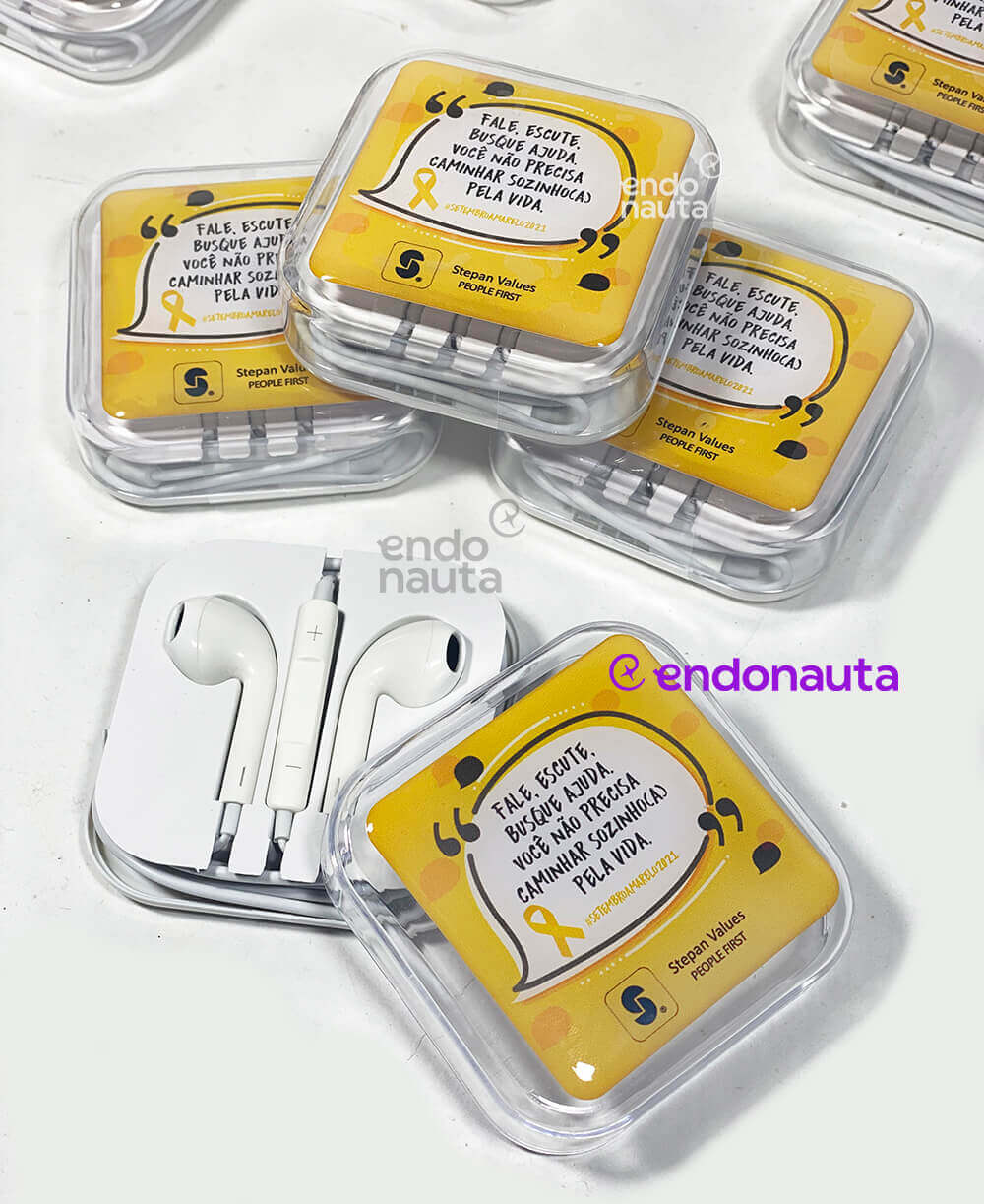 Kit composto por uma Caixinha em Acrílico Personalizado com o conceito de ouvir com o coração e logotipo da empresa, mais um Fone de Ouvidos Universal com Microfone.