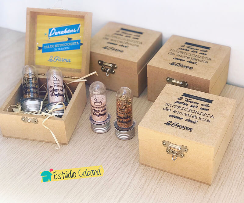 - 01 caixa em mdf tamanho 10x10x6cm, personalizada em adesivo vinil.