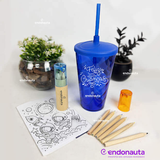 O Kit Colorir é uma opção criativa e divertida para o Dia das Crianças. Inclui um copo canudo personalizado de 500ml, um estojo com 06 lápis de cor e folhas com desenhos para colorir. Perfeito para presentear os filhos dos colaboradores, incentivando a imaginação e proporcionando momentos de diversão. Esse kit de Dia das Crianças personalizado com o logo da sua empresa vai fazer sucesso!