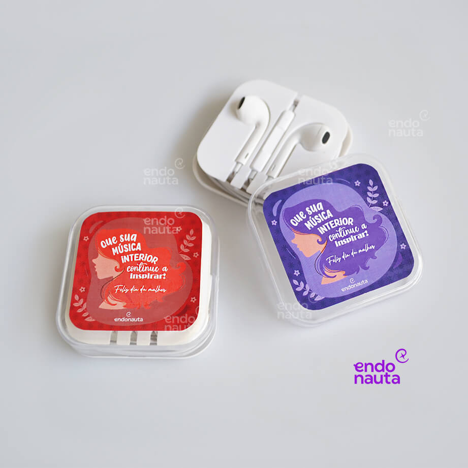 Brinde para o dia das Mulheres composto por Caixinha em Acrílico personalizada e Fone de Ouvido Universal com Microfone! Um brinde útil e criativo personalizado com seu logo.