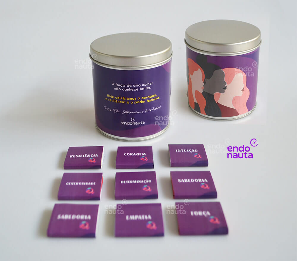 Acompanham 09 tabletes de chocolates personalizados com 09 valores de uma mulher: Generosa, Intuitiva, Guerreira, Destemida, entre outras!  As qualidades podem ser personalizadas de acordo com a sua necessidade. O verso de cada tablete pode ser personalizado com o seu logotipo. Acompanha também um Cartão com a História do Dia da Mulher.