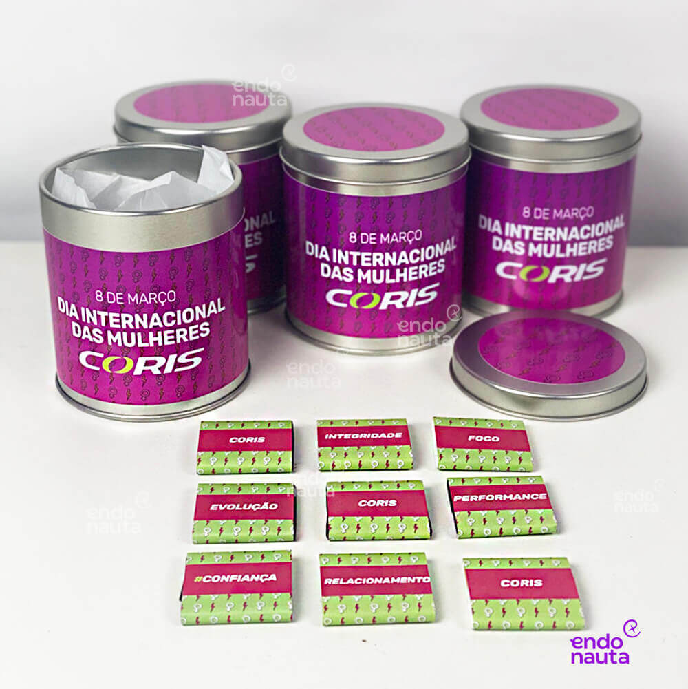 Lata Personalizada com layout especial para o Dia da Mulher. A frente da Lata pode ser personalizada com o nome de cada presenteada e o verso com a mensagem “Feliz Dia da Mulher” e o logotipo da sua empresa.