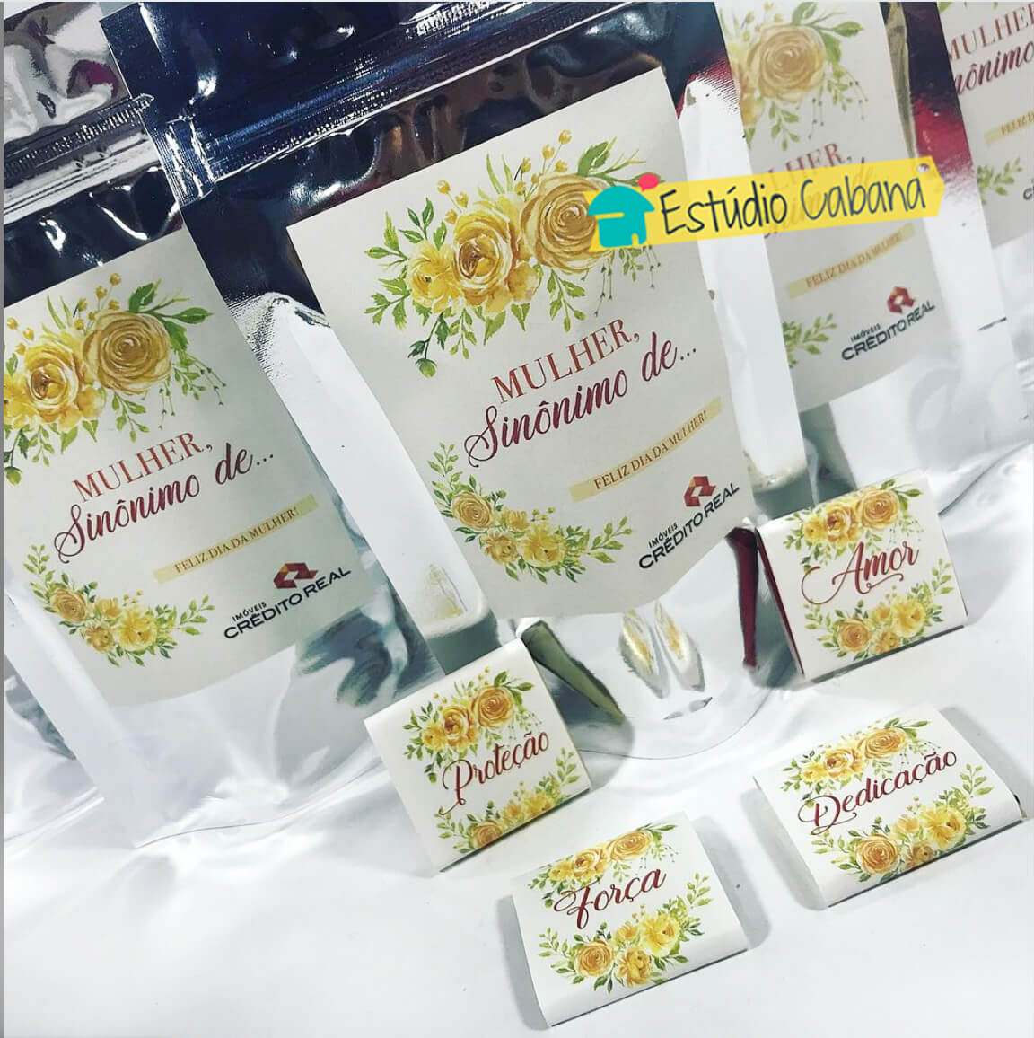 Saquinho personalizado contendo 04 tabletes de chocolates personalizados com as qualidades das Mulheres! Ótimo brinde para o Dia da Mulher na sua empresa!