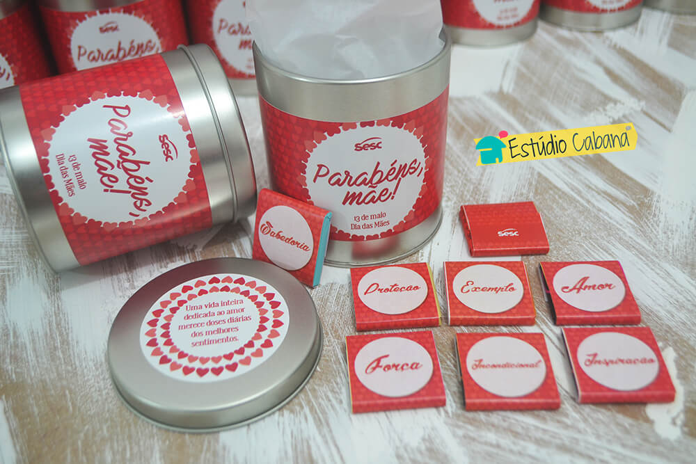 Mimo de endomarketing para as mães colaboradoras com lata personalizada com layout especial para o Dia da Mães e tabletes de chocolates personalizados com os desejos para as mães.