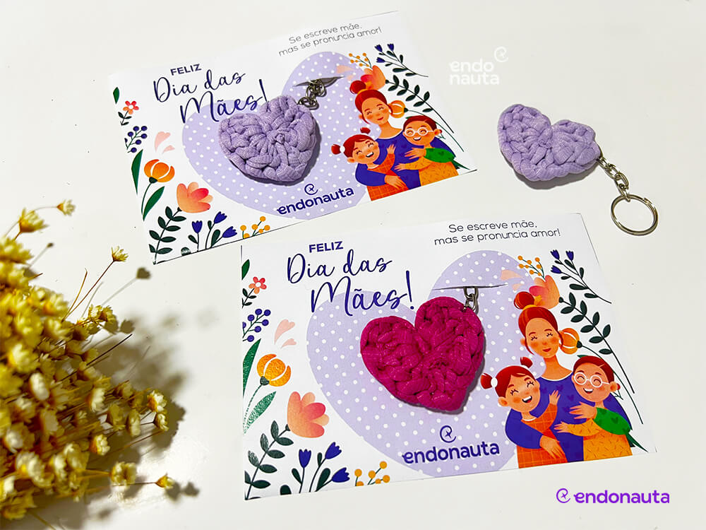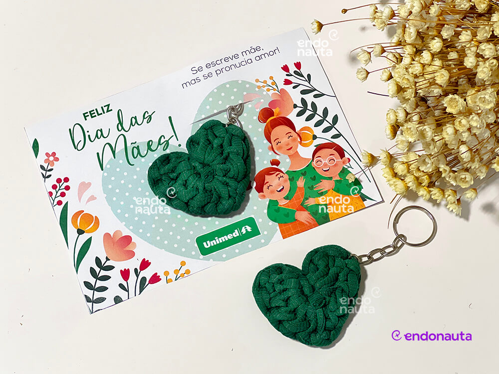 Demonstre carinho e reconhecimento com este cartão personalizado acompanhado de um chaveiro artesanal em formato de coração, feito com fio de malha de alta qualidade. Ideal para empresas que desejam oferecer um mimo afetivo e sustentável no Dia das Mães.