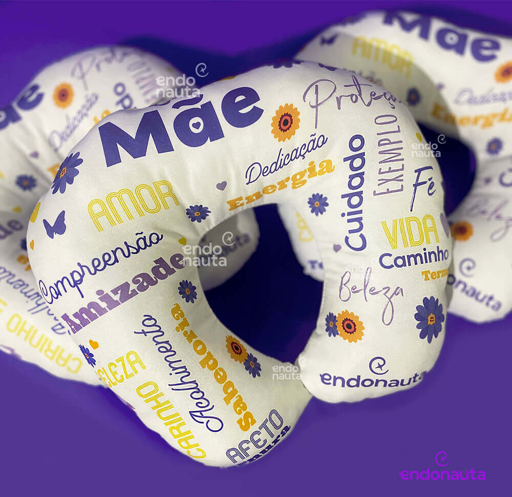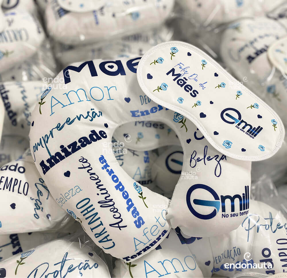 Kit personalizado para o Dia das Mães contendo almofada travesseiro de viagem personalizado e máscara de dormir tapa-olhos personalizado para encantar as mães da sua empresa.