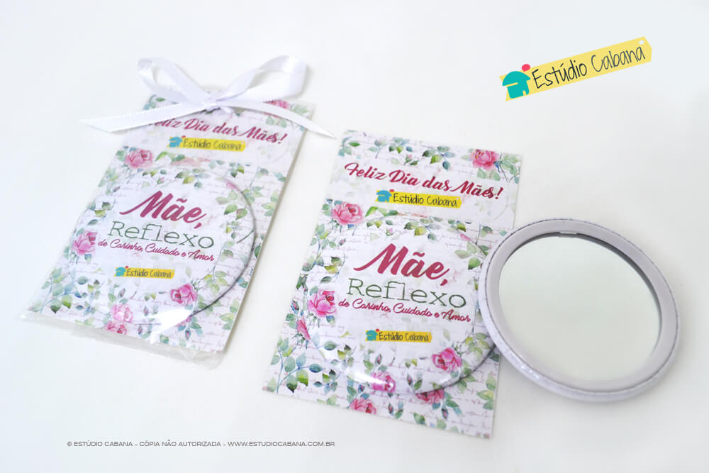 Um presente prático e sofisticado! Espelho de bolsa personalizado com mensagem inspiradora, embalado individualmente em saquinho com cartão especial e laço de cetim. Uma lembrança funcional e cheia de significado para as mães da sua equipe.
