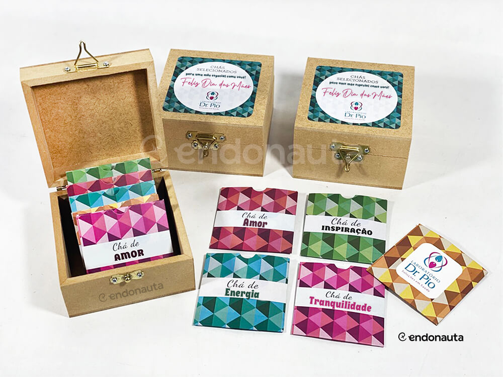 Caixa personalizada de madeira contendo 05 sachês de chás personalizados para o dia das Mães da sua empresa.
