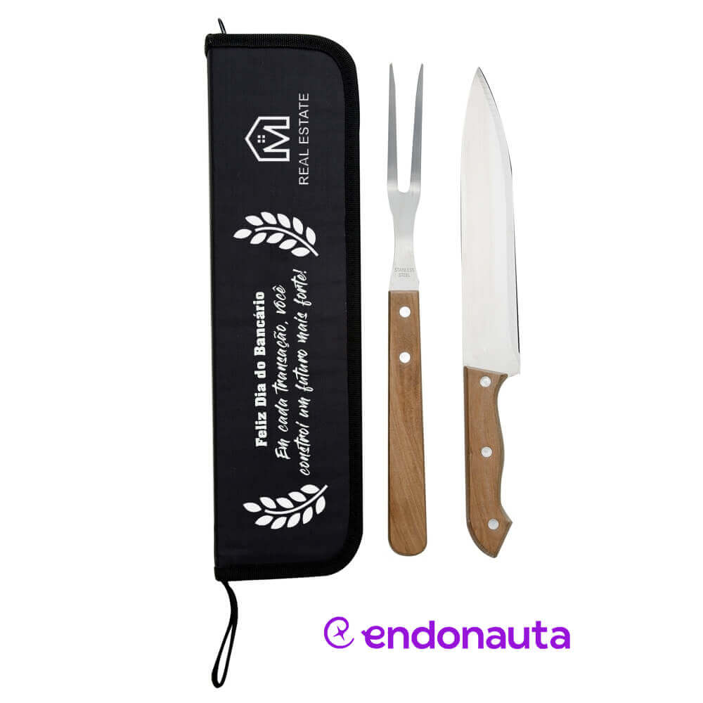 O Kit Churrasco acompanha bolsa personalizada, garfo e faca de madeira.