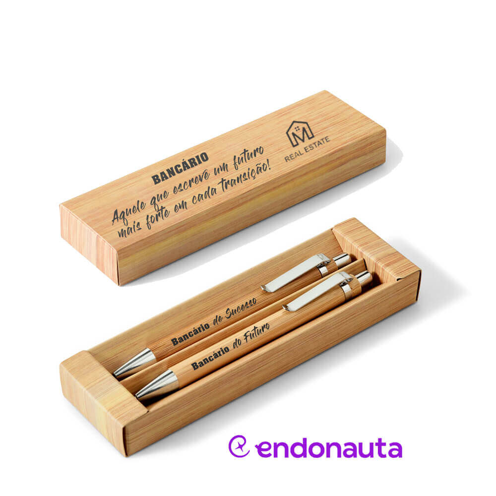 Conjunto de esferográfica e lapiseira em bambu, personalizados em 01 cor.