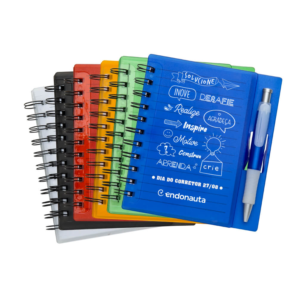 Brinde personalizado para o Dia do Corretor com Caderneta plástica wire-o com caneta e suporte para encaixe para brindes para o dia do corretor. Caneta plástica com detalhe emborrachado, carga esferográfica na cor azul e acionamento por clique. Personalização em Silk na cpa da caderneta frente 01 cor. Caneta não personalizada.