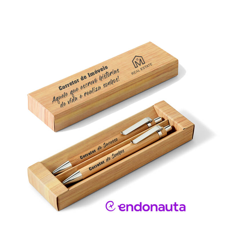 Conjunto de esferográfica e lapiseira em bambu, personalizados em 01 cor para o Dia do Corretor.