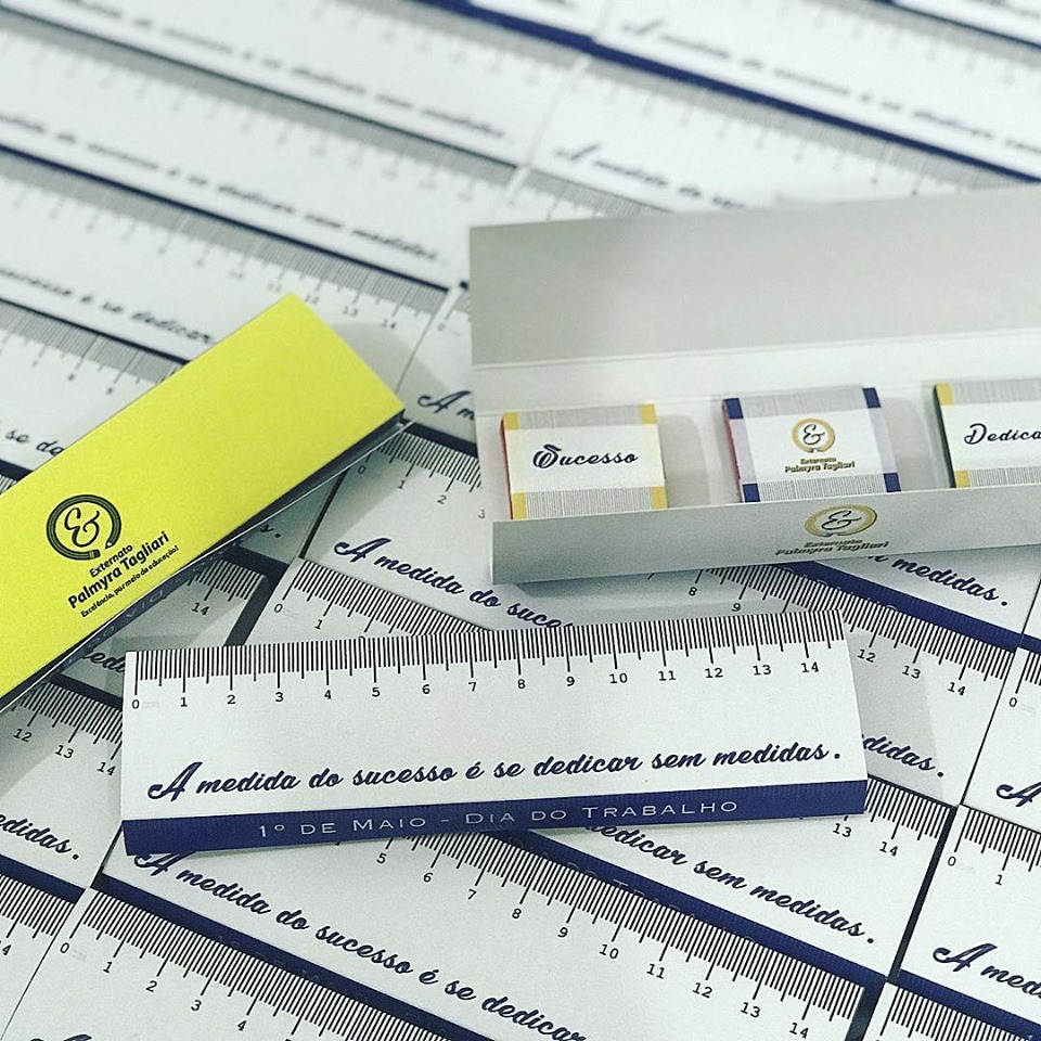 A régua é um cartão confeccionado em Papel Couchê 250g (15cm x 4cm x 1cm), personalizado com o seu logotipo. O cartão acompanha 03 tabletes de chocolates também personalizados, com o logotipo da empresa ou outra mensagem a desejar. Peso aproximado: 25gr.
