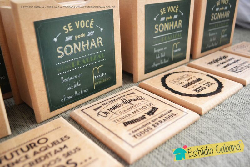 Que tal oferecer uma mensagem marcante e motivadora para seus colaboradores, parceiros ou clientes, através de uma linda lata, uma caneca de inox e dois porta copos personalizados de madeira?