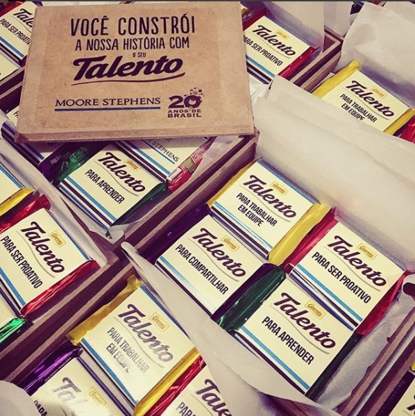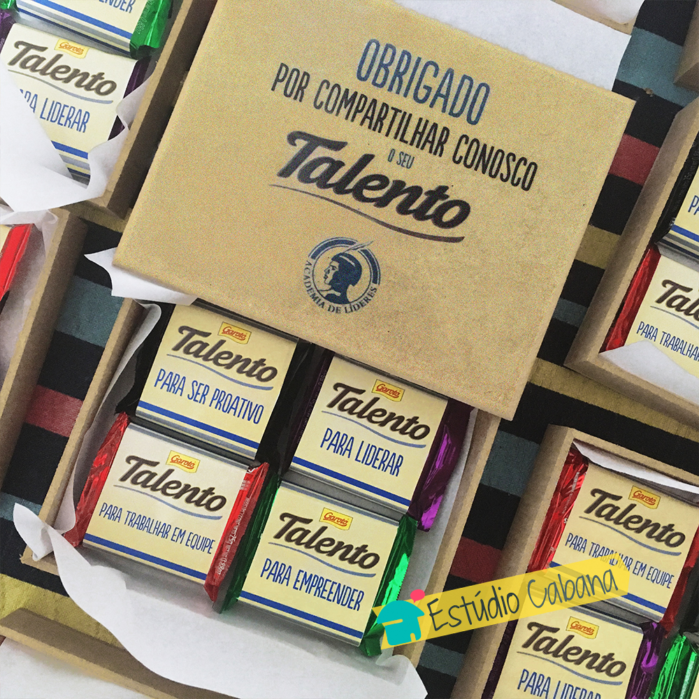 A Caixa de Talentos é uma ótima solução de presente para valorizar talentos e qualidades! A Caixa personalizada contém 04 barrinhas de chocolate Talentos Garoto 25g Personalizados. Cada barrinha, um talento a ser valorizado. Um presente corporativo criativo para o seu funcionário!