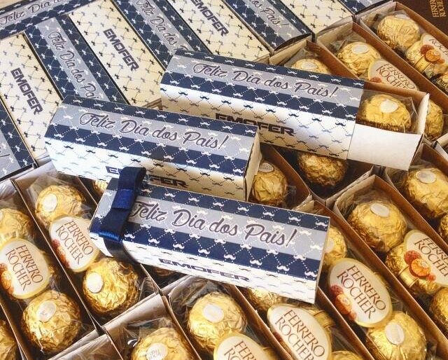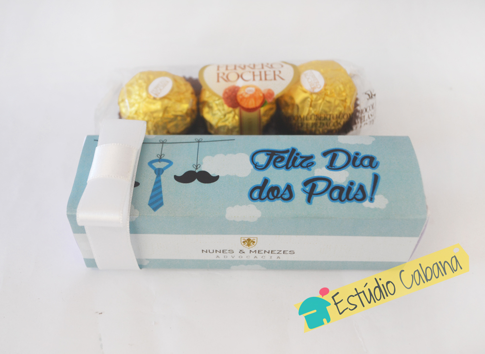 Caixa personalizada com 03 Bombons Ferrero Rocher. Personalizado com a identidade visual da sua empresa. Uma lembrança mais formal e de bom gosto para atender ao público mais exigente. Acabamento com laço Chanel opcional