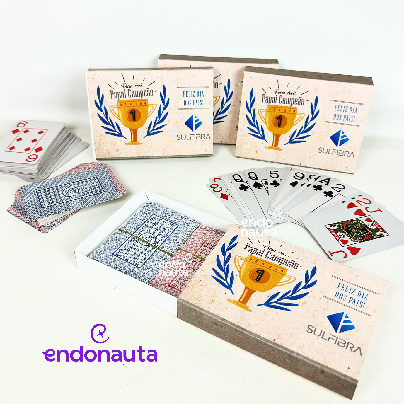 Para o papai campeão, um presente corporativo personalizado com Talentos personalizado, dois jogos de baralho e uma caixa personalizada com a identidade visual da sua empresa! Um kit divertido e personalizado para os colaboradores pais!