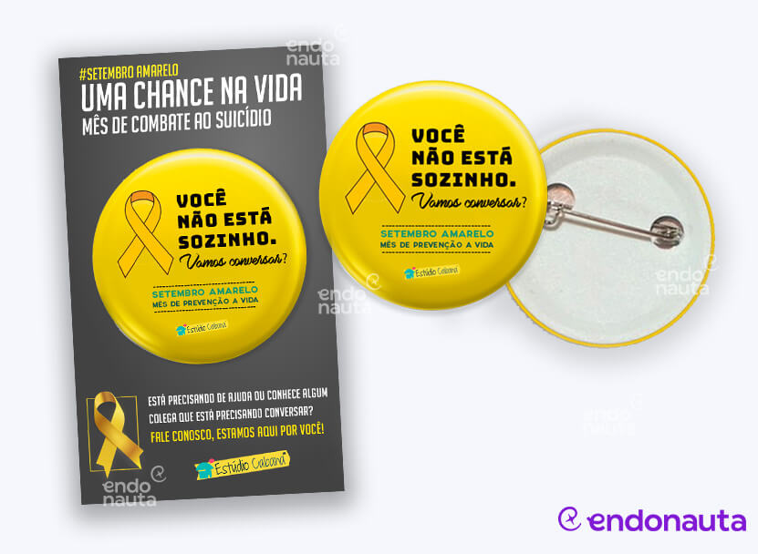Um botton é uma ótima maneira de incentivar o colaborador a adotar a campanha do setembro amarelo durante todo o mês. Um importante lembrete de que não está sozinho e que ele está aberto a ouvir a conversa de outros colegas também. Todos juntos nesta campanha de amor a vida!