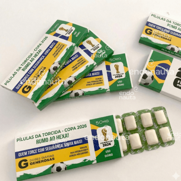 Embalagem Personalizada (12x5cm) – Design exclusivo inspirado na temática da Copa 2026, com acabamento premium que simula uma cartela de “medicamento para a torcida”.