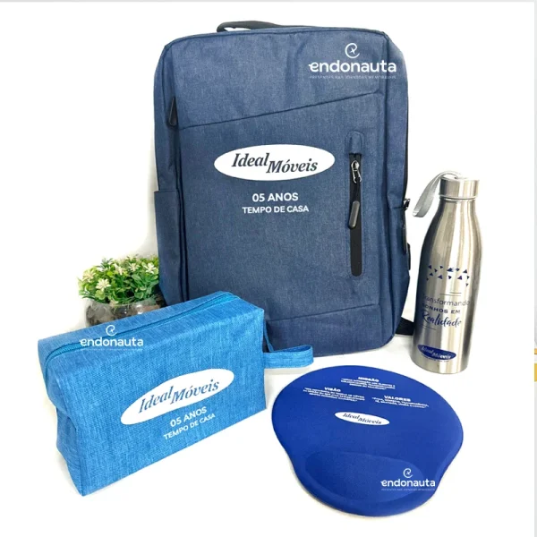 Valorize sua equipe com o Kit Ideal! Inclui mochila para notebook, garrafa inox, mousepad e necessaire. O brinde corporativo perfeito para unir produtividade, conforto e organização.