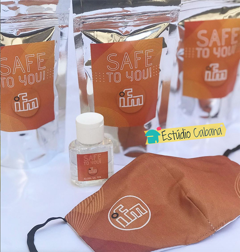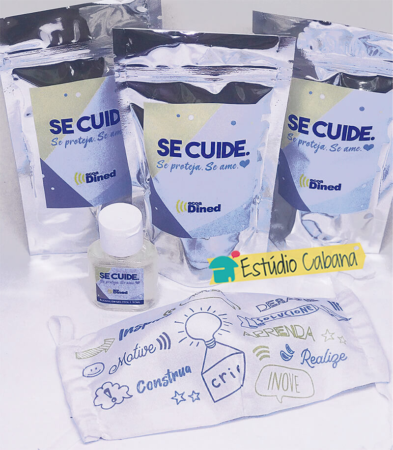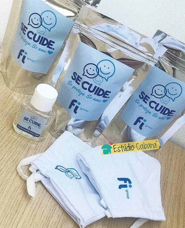 O Kit acompanha embalagem personalizada com o seu logo e identidade visual, Álcool em Gel 70%, e máscara de tecido (lavável). Prevenir é um ato de amor a vida!