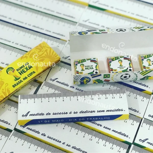 03 Tabletes de Chocolate Premium – O toque sensorial da campanha. Cada tablete é envolvido em cintas personalizadas com a identidade visual da sua jornada rumo ao Hexa.